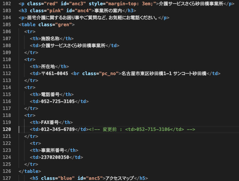 homehelp フォルダ内にある index.html という名前の HTML ファイルを開くと、上の画像に表示されている「 介護サービスさくら砂田橋事業所 」の情報を編集することができます。