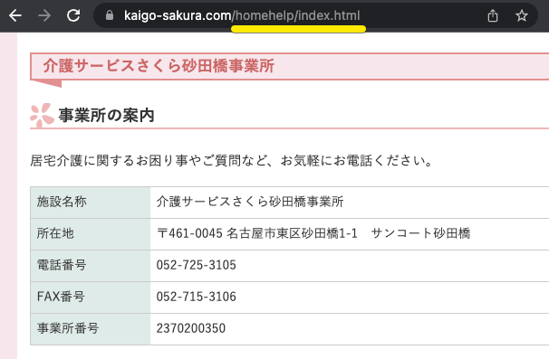 と表示されています。( Google Chrome では kaigo-sakura.com/homehelp/index.html と表示されます )
