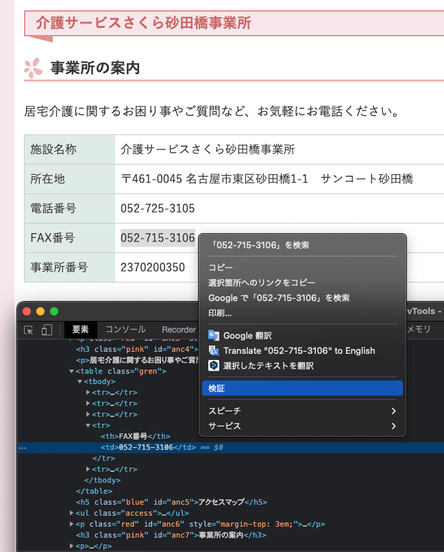 今回の例では、この [ FAX 番号 ] は <td> タグで記載・囲まれており、前後には <th> タグや <tr> タグ、つまりは表組み ( テーブル <table> ) に関連するタグによって表示されていることがわかります。